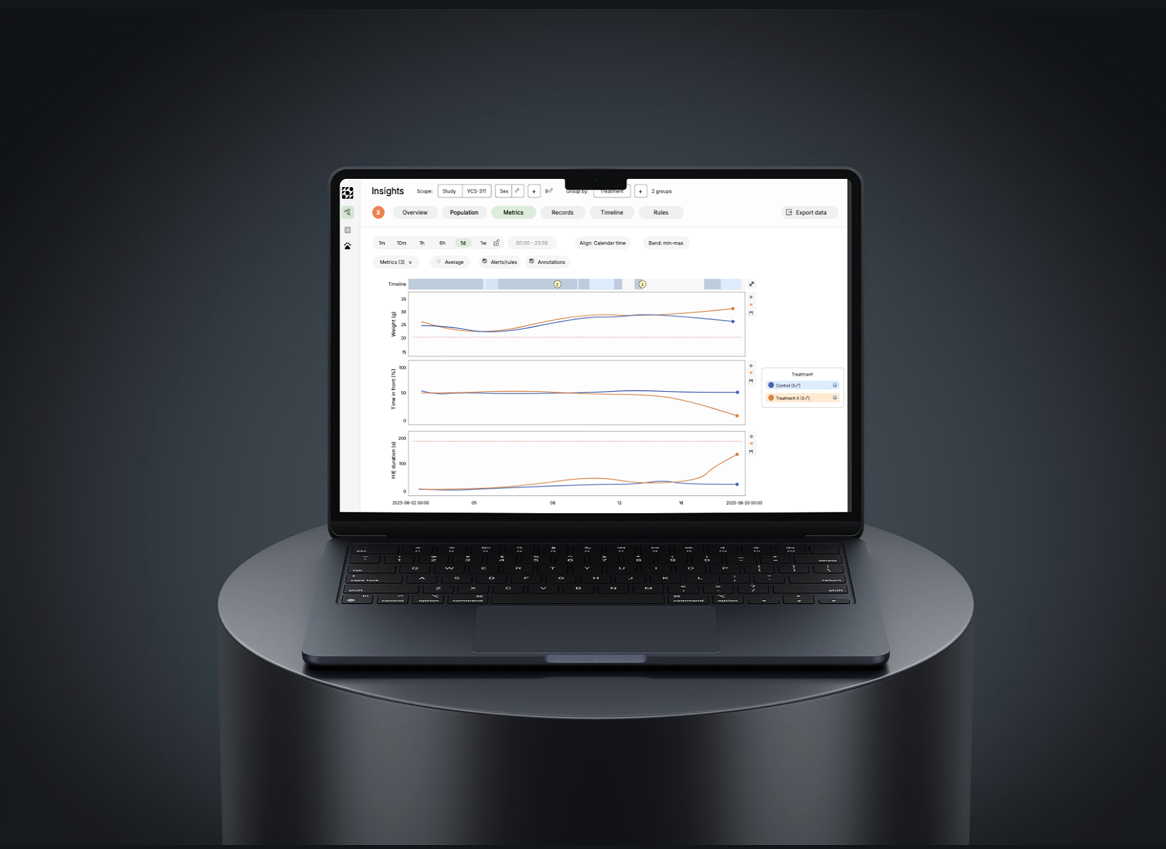 By tracking health parameters (weight, activity, respiratory) true to those monitored in clinical phases, we allow researchers and caretakers to truly understand the impact of their drugs on a systemic basis.